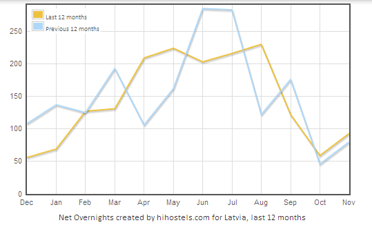 No “Hostelling Latvia” 11 biedriem, no kuriem deviņi atrodas Rīgā, viens Liepājā un viens Jūrmalā, deviņi ir aktīvi pārstāvēti rezervēšanas sistēmās, tādējādi nodrošinot stabilu kanālu rezervāciju veikšanai, kā arī ļaujot analizēt operatīvos datus. Viena no lielākajiem budžeta tūrisma mītņu rezervēšanas portāliem www.hihostels.com dati liecina, ka 2010.gada viesu skaits hosteļos samazinājās par apmēram 10-15%, bet šogad šis kritums ir apstājies, sākusies gan viesu skaita, gan apgrozījuma stabilizācija, vērojams pat neliels pieaugums. “2011.gadā iezīmējusies tendence samazināties tūristu skaitam no tradicionālajiem tūrisma tirgiem un strauji pieaugt viesu skaitam no Vācijas (par 100%), Japānas (par 800%), Ukrainas (par 30%).