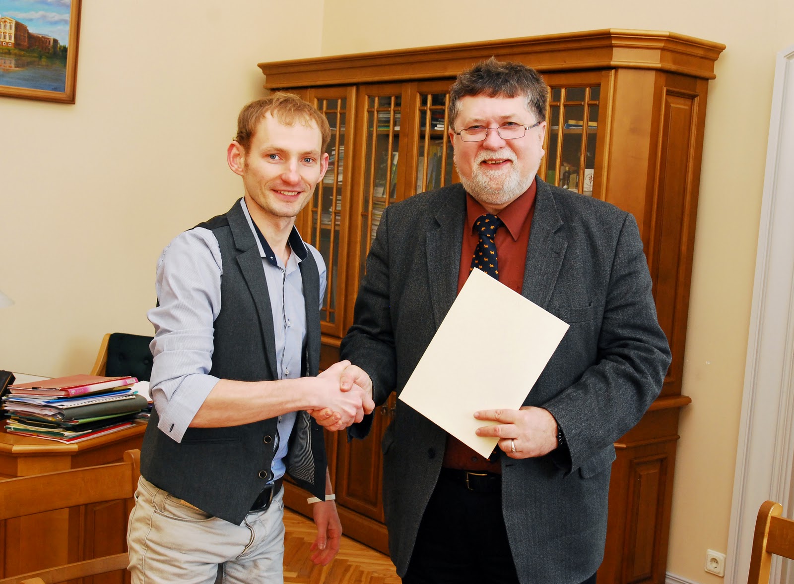 | Uldis Šalajevs un LLU Attīstības fonda valdes priekšsēdētājs Arnis Mugurēvičs Foto: Gita Ogņeva (LLU) |