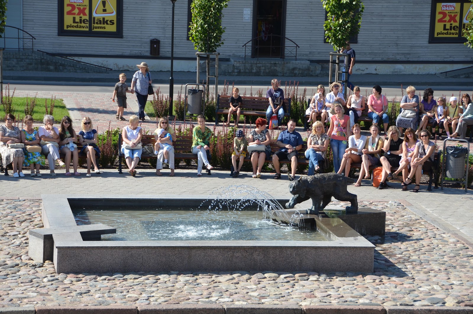 | Vecpilsētas laukumā lūsis savu vietu radis strūklakas malā, sperot soli pāri simboliskai upei Daugavai – strūklakai, kas met krāces mutuli. |