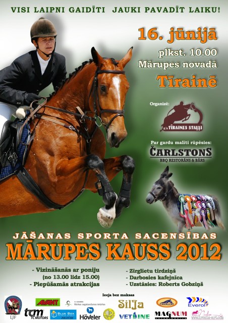 Sestdien, 16.jūnijā no plkst. 10:00 Mārupes novada Tīrainē, pļavā pie Jelgavas vecās šosejas iepretim Tīraines dzelzsceļa stacijai, notiks jāšanas sporta sacensības “Mārupes kauss 2012”. Sacensības organizē z/s „Tīraines staļļi” ar Latvijas Jātnieku federācijas atbalstu.