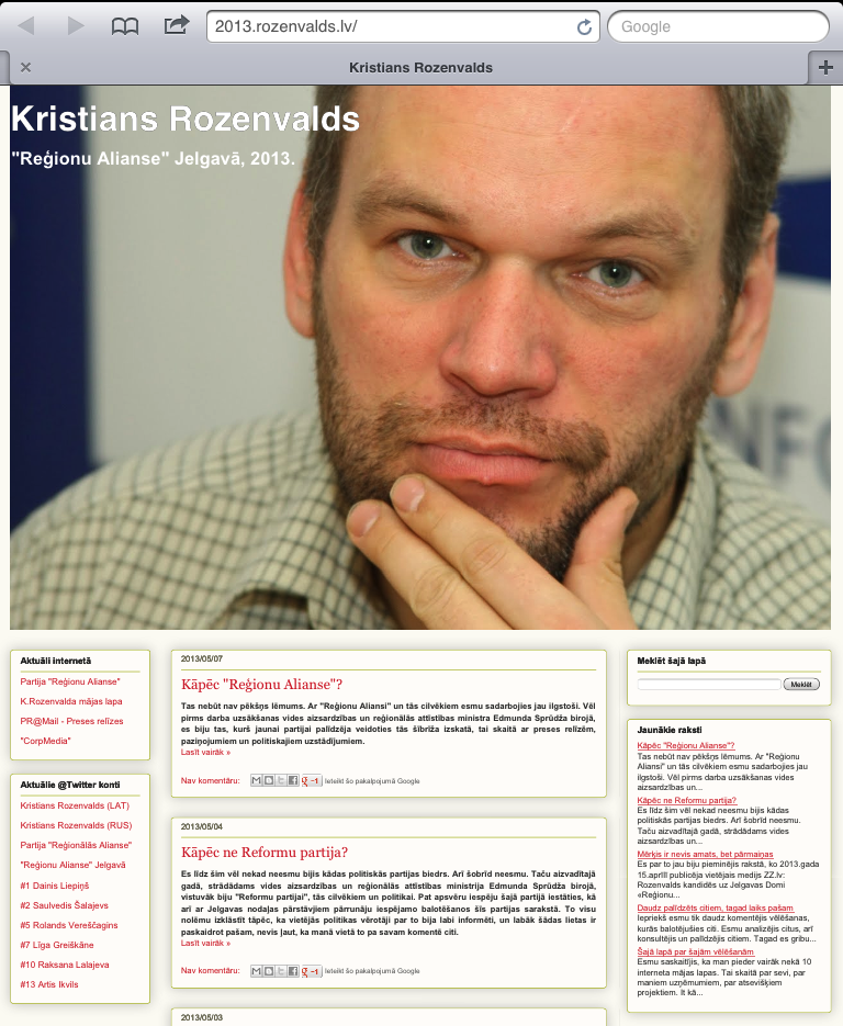 Sabiedrisko attiecību speciālists Kristians Rozenvalds, kurš partijas “Reģionu Alianse” sarakstā balotējas Jelgavas pilsētas domes vēlēšanās, nolēmis saziņai ar vēlētājiem izmatot tikai speciāli pirms vēlēšanām izveidotu interneta mājas lapu http://2013.rozenvalds.lv, kā arī savus profilus sociālajos tīklos.