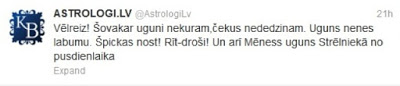 Projekta Astrologi.lv veidotājs sertificētais astrologs un numerologs jau vakar Twitterkontā uzstājīgi brīdināja, ka 20. jūnijā nav ieteicams veikt jebkādas darbības ar uguni un ka šajā dienā uguns mēles var nest lielu postu.