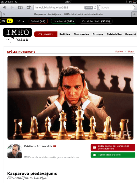 Interneta diskusiju forumā IMHOclub.lv šīs vietnes latviešu versijas galvenais redaktors Kristians Rozenvalds raksta, ka izcilais šahists un un pazīstamais Krievijas opozicionārs Garijs Kasparovs ar savu ar lūgumu iegūt Latvijas pilsonību, ir piespēlējis Latvijai iespēju kvalitatīvi un efektīvi nodot vēstījumu par to, ka Latvija ir vislabākā patvēruma vieta turīgiem un godājamiem Krievijas cilvēkiem, kuriem politisko, radošo un biznesa brīvību traucē esošais Krievijas režīms.