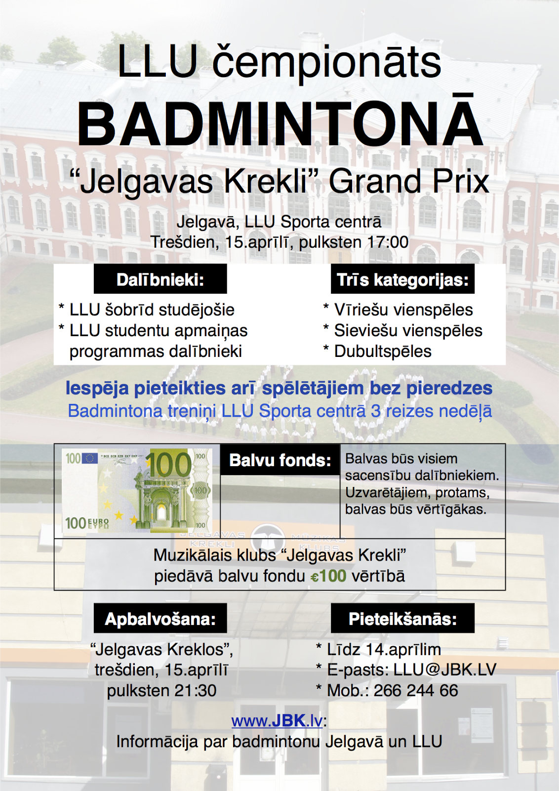 LLU čempionāts badmintonā “Jelgavas Krekli Grand Prix” notiks trešdien, 15.aprīlī, no pulksten 17:00, bet apbalvošanas ceremonija un bankets tiks rīkots 21:30 “Jelgavas Kreklos”, un sacensību dalībnieki uz apbalvošanas pasākumu ir ielūgti kopā ar pavadošajām personām.