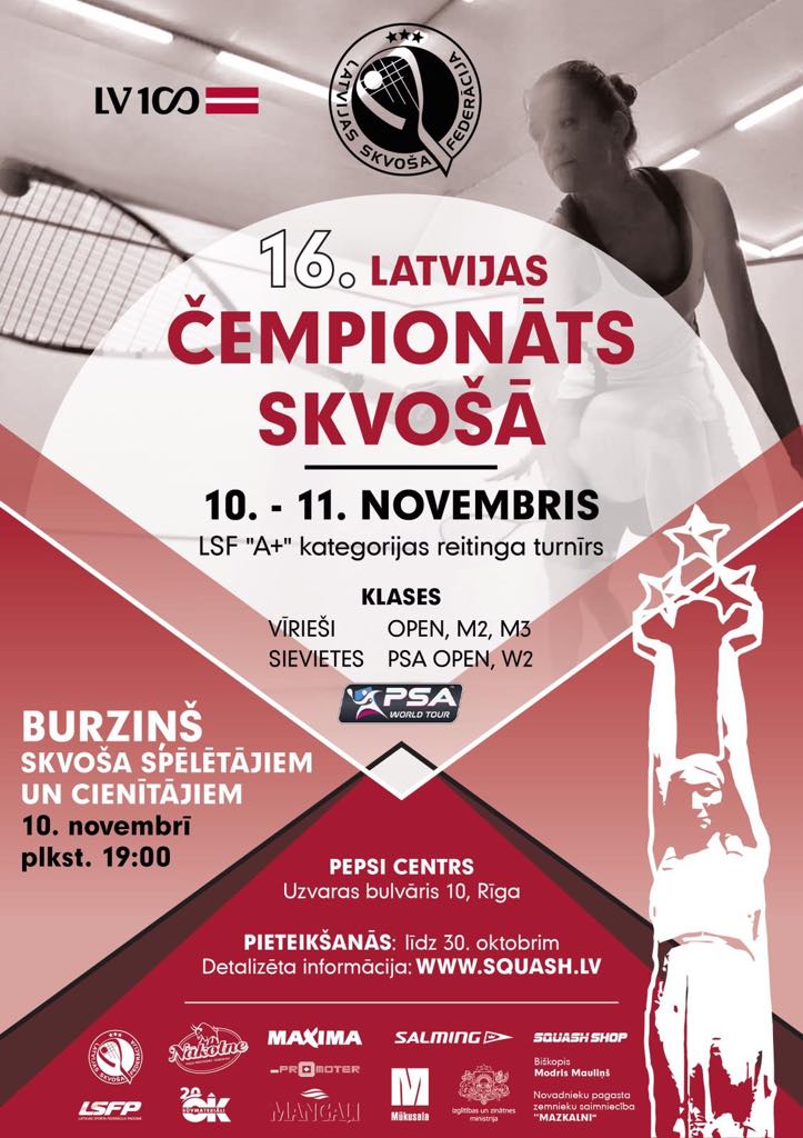 Latvijas čempionāts notiks Rīgā, Pepsi centrā (Uzvaras bulvāris 10), pulcējot spēcīgākos Latvijas skvoša spēlētājus. Tāpat kā iepriekšējos gadus, čempionātā startēs un titulus aizstāvēt grasās vairākkārtējie Latvijas čempioni Aleksandrs Pāvulāns un Ineta Mackeviča, startēs arī citi Latvijas izlases sēlētāji un spēlētājas, tostarp pieaugušo izlasē spēlējušie Latvijas junioru čempioni.