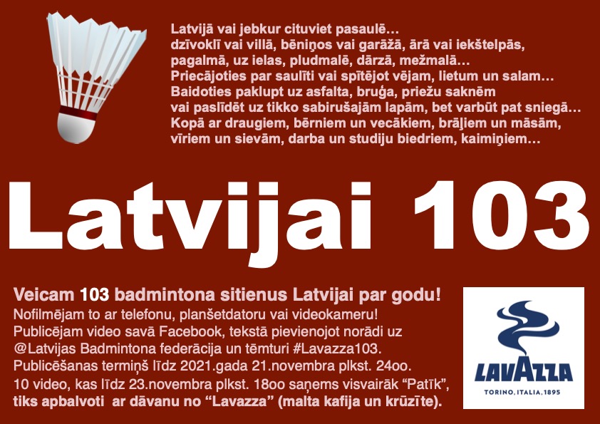“Veicam 103 badmintona sitienus Latvijas par godu! Nofilmējam to ar telefonu, planšetdatoru vai videokameru! Līdz 2021.gada 21.novembra plkst. 24:00 publicējam šo video savā Facebook lapā, tekstā pievienojot norādi uz Latvijas Badmintona federāciju un tēmturi #Lavazza103,” aicina Latvijas Badmintona federācija.