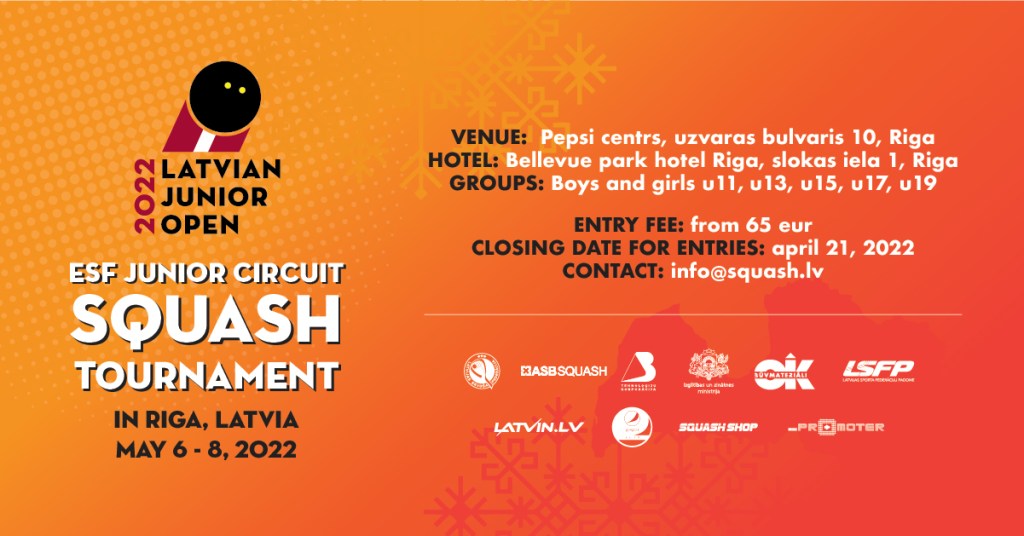 No 6. līdz 8. maijam Rīgā pirmo reizi notiks Eiropas skvoša federācijas reitinga turnīrs junioriem “Latvian Junior Open 2022”. Šāds turnīrs sākotnēji bija ieplānots 2020.gadā, taču tika atlikts Covid-19 ierobežojumu dēļ. Latvijas turnīram ir pieteikti 34 dalībnieki no 9 valstīm. Visvairāk, 18 spēlētāji, ir no Latvijas.