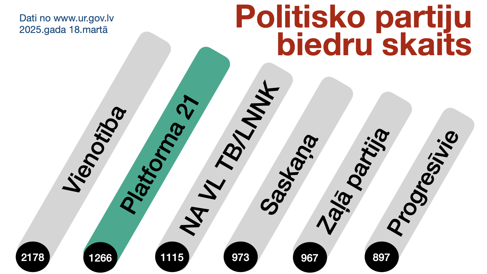 Saskaņā ar LR Uzņēmuma reģistra publiski pieejamo informāciju par politisko partiju biedru skaitu, visvairāk reģistrēto biedru 2025.gada 1.martā bija reģistrēts partijā “Vienotība” – 2176. Otrā vietā “Platforma 21” – 1266. Salīdzinoši daudz biedri ir reģistrēti arī Nacionālā apvienība „Visu Latvijai!” – „Tēvzemei un Brīvībai/LNNK” – 1115, sociāldemokrātiskajā partijā “Saskaņa” – 973, Latvijas Zaļajā partijā – 967, partijā “Progresīvie” – 897. 2025.gada 17.martā vēl nebija pieejami dati par Latvijas Zemnieku savienību un Latviju Pirmajā vietā.