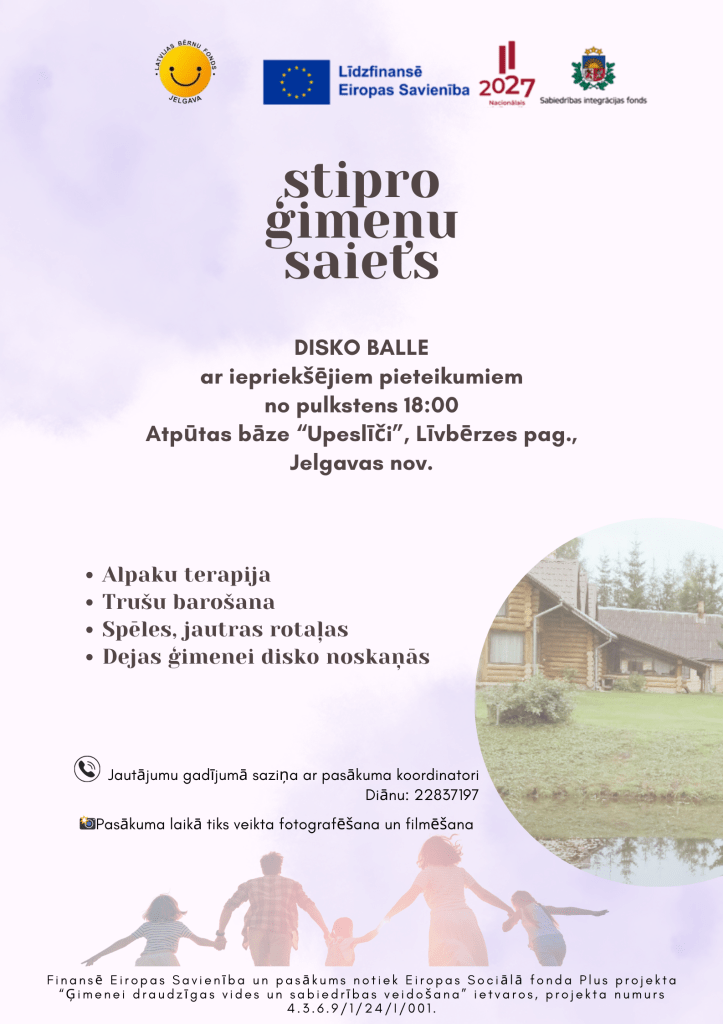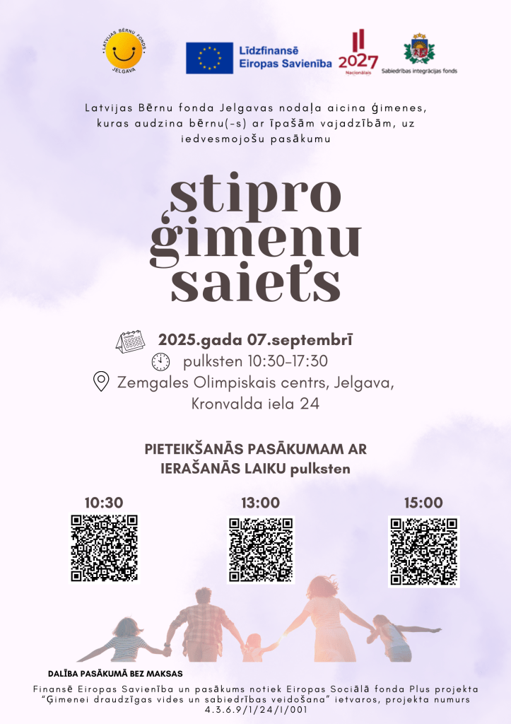 Pasākumu “Stipro ģimeņu saiets” finansē Eiropas Savienība un tas notiek projekta “Ģimenei draudzīgas vides un sabiedrības veidošana” (ESF+ projekts Nr.4.3.6.9/1/24/I/001), apakšprojekta “Zemgales stipro ģimeņu saiets” (līg. 2025.LV/GDV/043/L26) ietvaros.