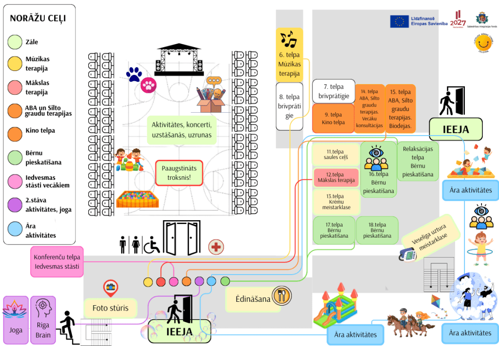 Pasākumā “Stipro ģimeņu saiets” tiks organizētas mākslas, mūzikas un ABA terapijas, meistarklases vecākiem par veselīga uzturu un krēmiem, jogas nodarbības, vecāku konsultācijas, iedvesmas stāsti. Tiks organizētas arī āra aktivitātes: piepūšamās atrakcijas, iglu kluči, bumbu baseins, izjādes ar zirgiem, putu ballīte. Būs arī ēdināšanas zona ar gardiem ēdieniem un dzērieniem. Vecāku konsultāciju laikā bērniem būs nodrošināta pieskatīšana.